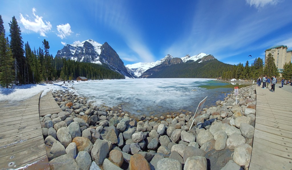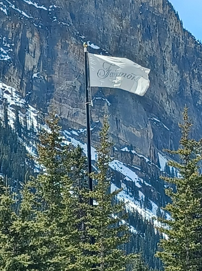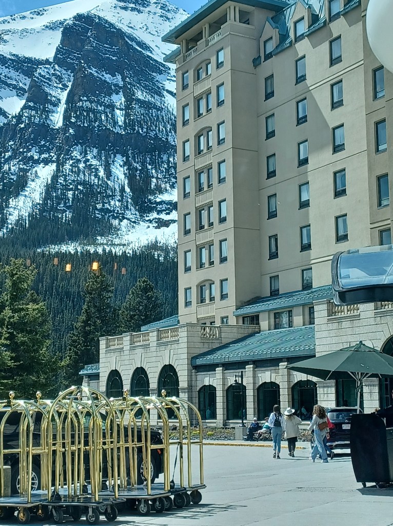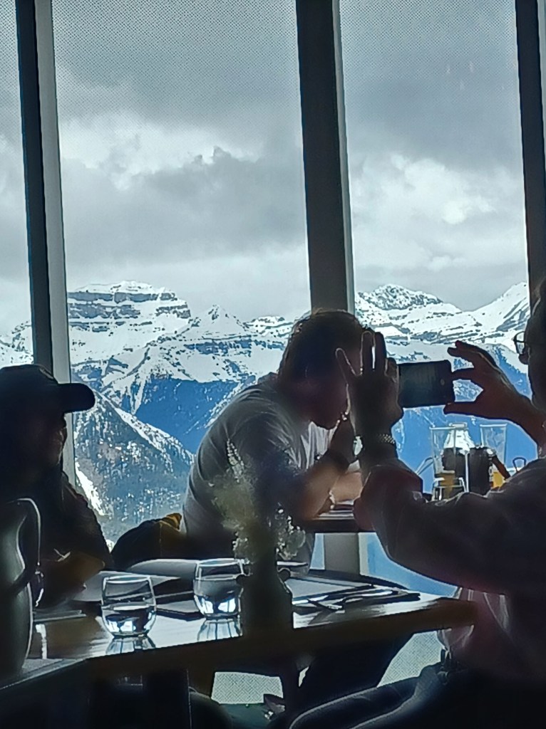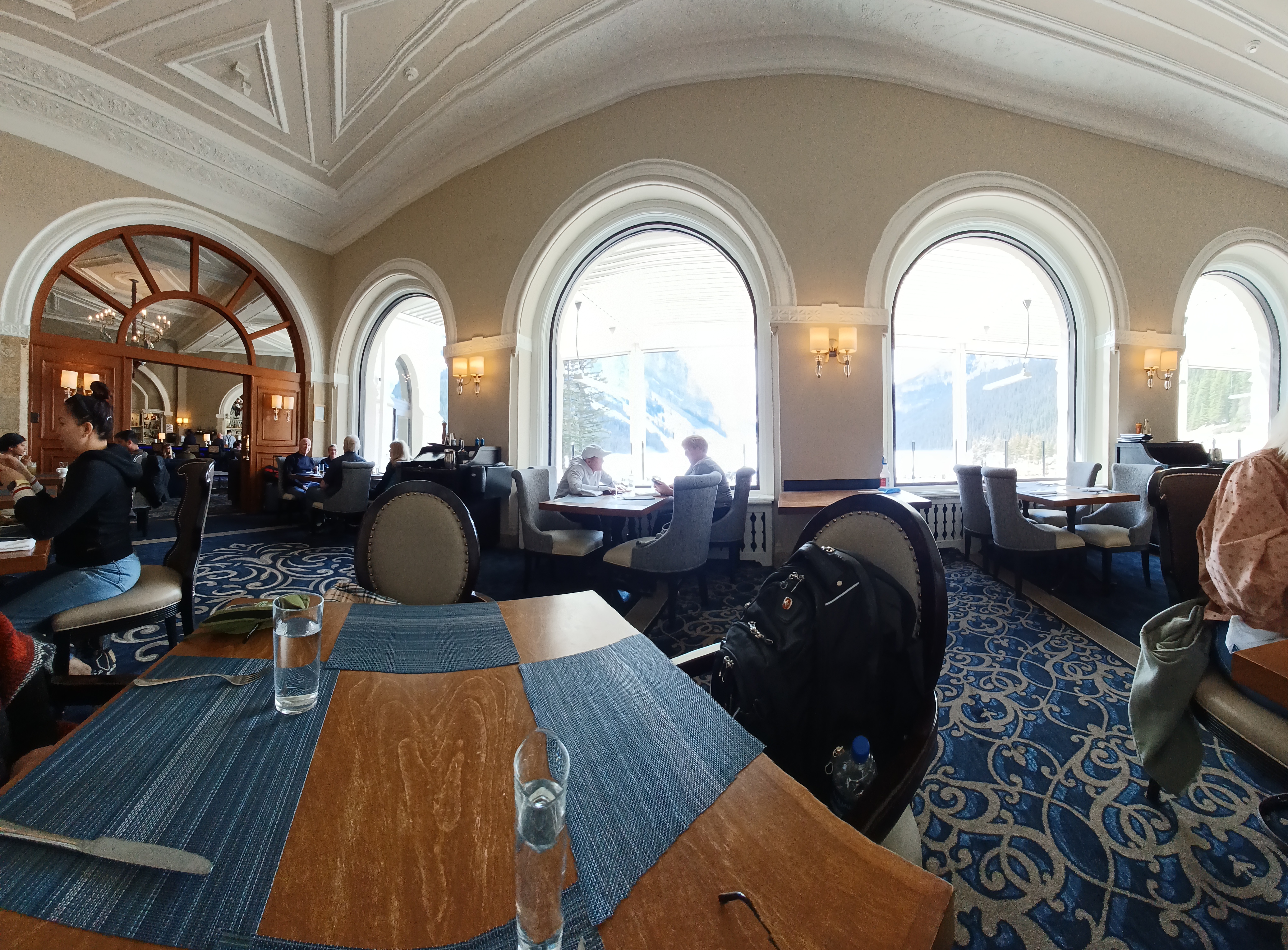 The Lakeview Lounge, located inside the Fairmont Chateau Lake Louise—an exclusive mountain resort—offers a direct view of the lake while dining.